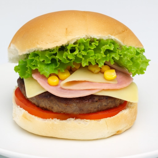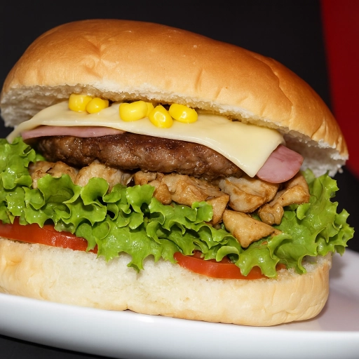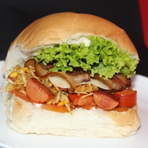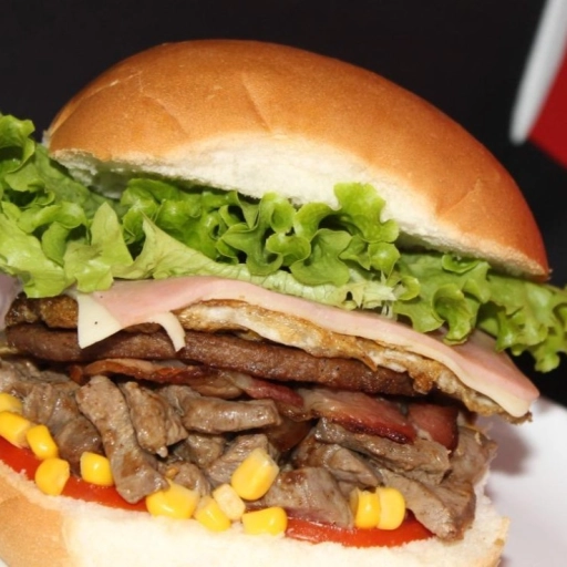 Pão de hamburguer, filé mignon, presunto, muçarela, milho, alface, tomate.