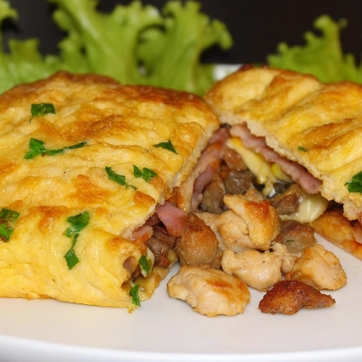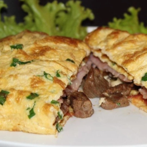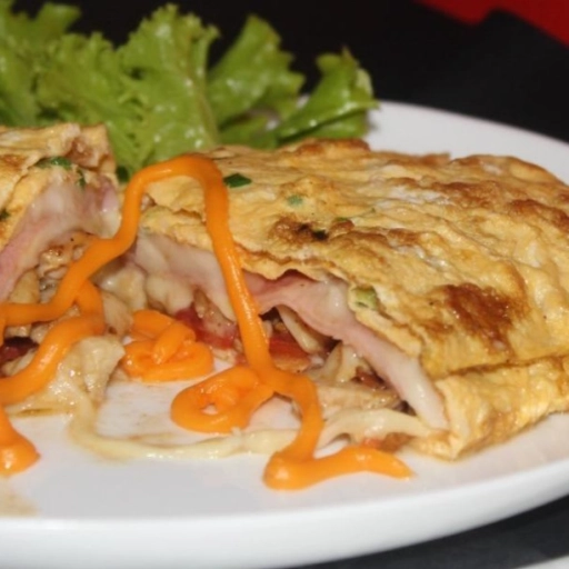 5 ovos, filé mignon, presunto, muçarela, tomate, bacon, catupiry, cheddar e cheiro verde.