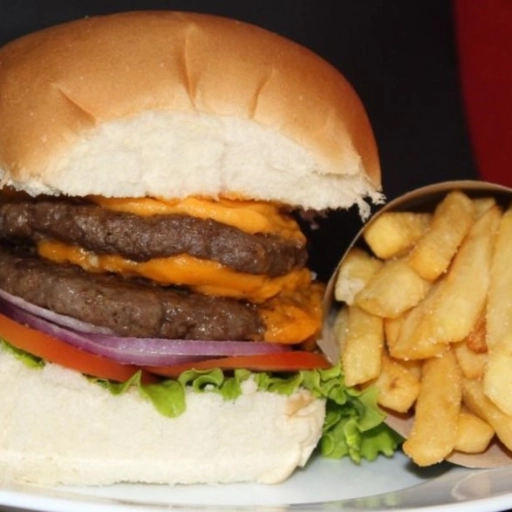 Pão brioche, 2 hambúrguer 100g, queijo cheddar, alface, tomate, cebola roxa + batata frita 🍔🍟