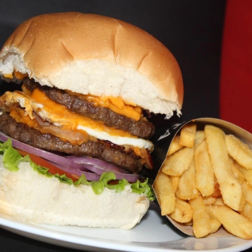 Pão brioche, 2 hambúrguer 100g, queijo cheddar, bacon, ovo, alface, tomate, cebola roxa + batata frita 🍔🍟