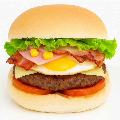 Pão de hamburguer, filé mignon, presunto, muçarela, milho, ovo, bacon, alface, tomate.