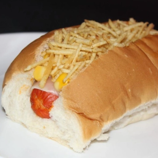 Pão de hamburguer, 2 salsichas, batata palha, muçarela, milho, alface, tomate, bacon.