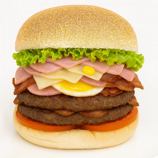 Pão de hamburguer, filé mignon, hamburguer, presunto, muçarela, bacon, ovo, milho, alface, tomate.
